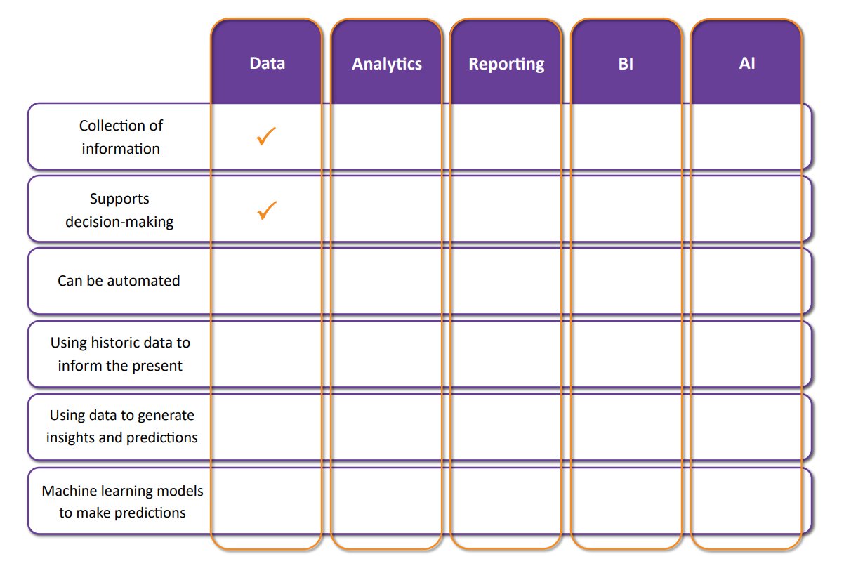As seen in the tables above, data, analytics, reporting, BI, and AI are interconnected components that generate insights and drive informed decision-making within an organisation.